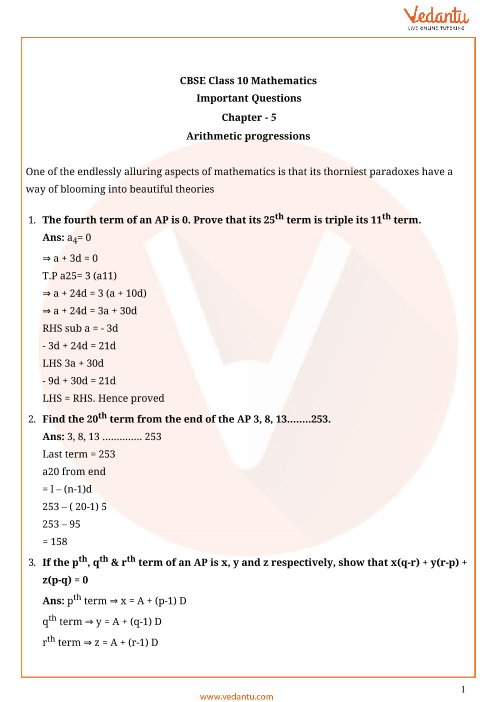 Important Questions For Cbse Class 10 Maths Chapter 5 Arithmetic Progressions