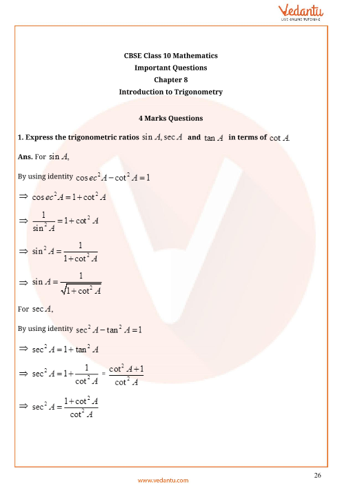 Important Questions For Cbse Class 10 Maths Chapter 8 Introduction To Trigonometry