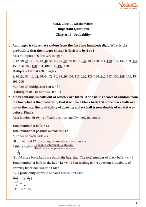 Important Questions For Cbse Class 10 Maths Chapter 15 Probability